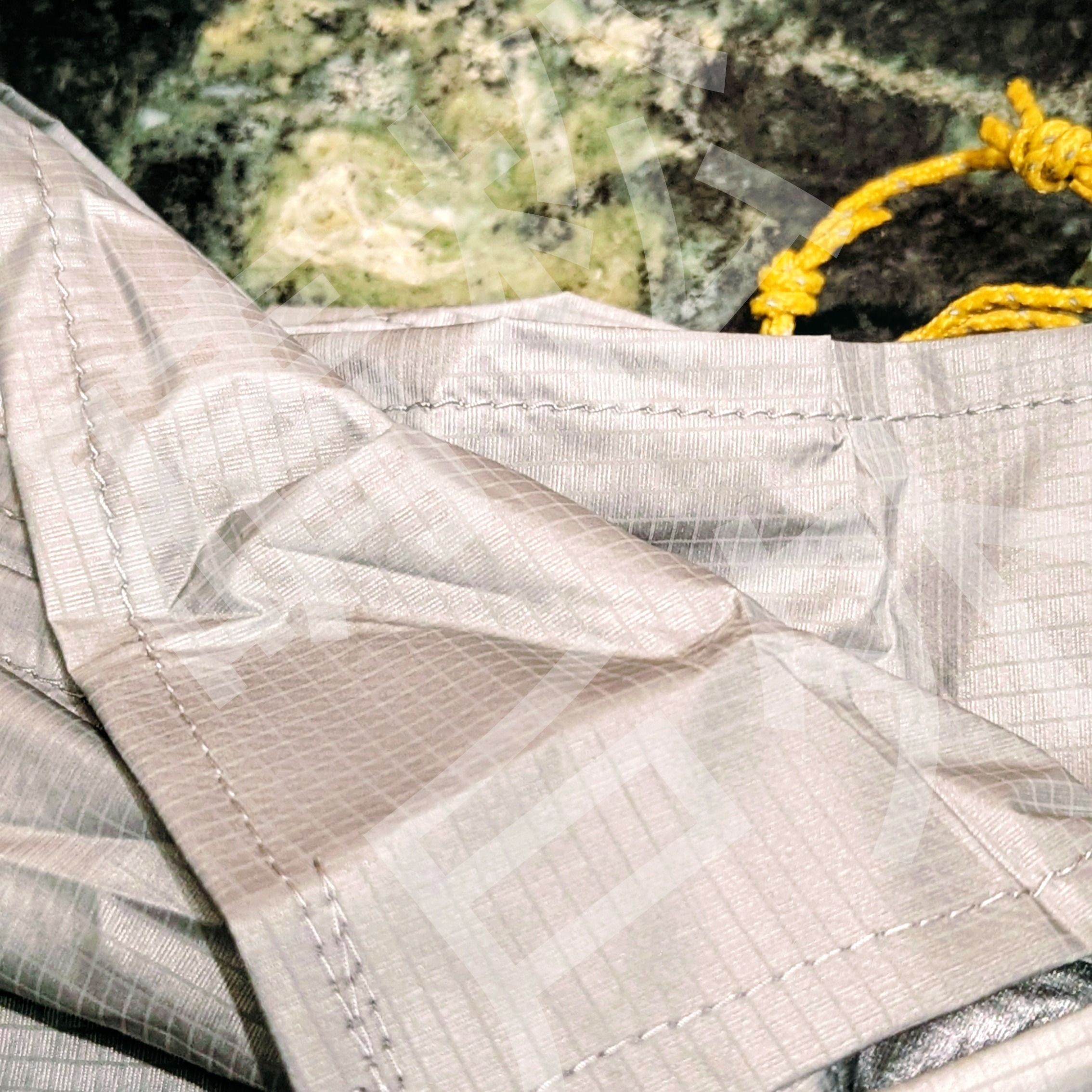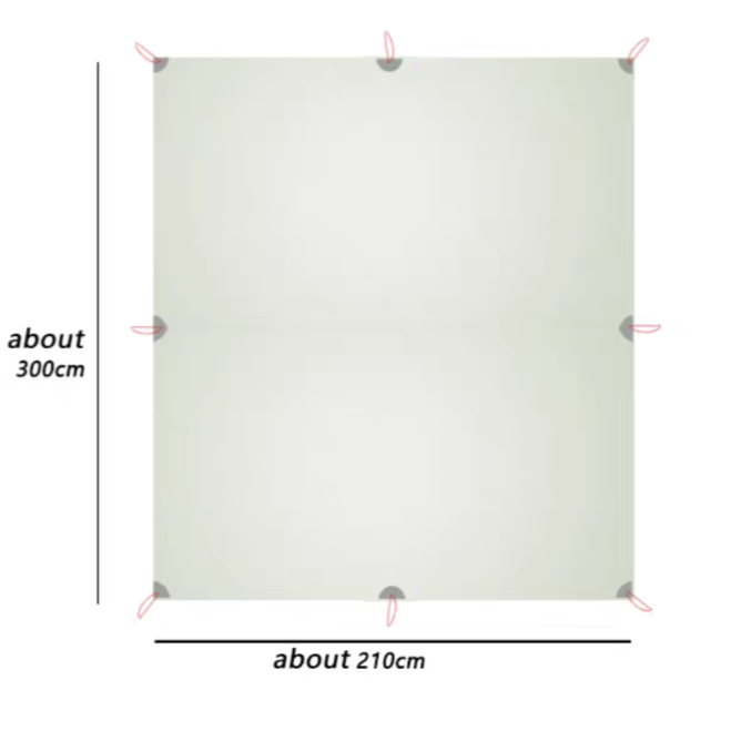 面積約 3 x 2.1 米,15D 布料,銀膠塗層。提供8個固定節點,可更有彈性搭設,重量僅 280 公克 (已記入收納袋),輕量化的好選擇。適合 1 - 3 人。